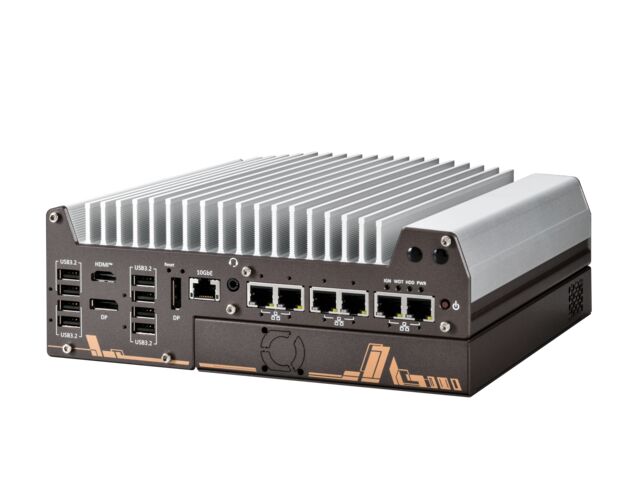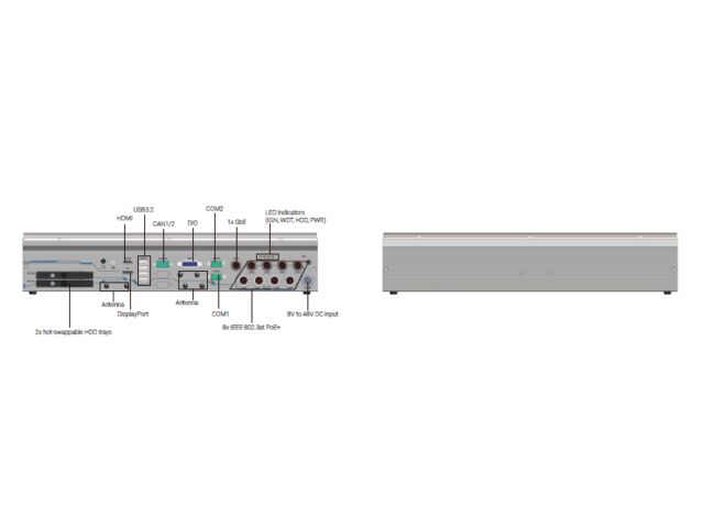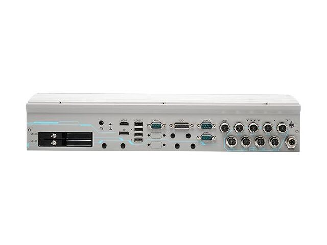 “ ‧ Intel® 14th/ 13th/ 12th-Gen LGA1700 processor (35W/65W) ‧ Fanless GPU computer with NVIDIA® RTX 2000 ADA ‧ 2U 19” chassis for rack-mount or wall-mount ‧ 8V to 48V wide-range DC input via M12 L-Coded connector ‧ 8x GbE PoE+, 1x GbE ports via M12 X-Coded connectors ‧ On-board isolated CAN bus for in-vehicle communication ‧ 1x M.2 2280 M key with PCIe-Gen 4x4 for NVMe storge ‧ 2x full-size mPCIe sockets with internal SIM sockets ‧ -25°C to 55°C wide-temperature fanless operation ”
