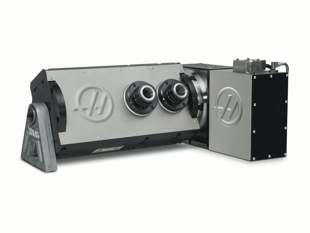 Dual-Spindle 5C Collet Tilting 2-Axis Rotary. Requires Haas mill with 4th-and 5th-axis drives for true 4th- and 5th-axis operation. This unit has no collet closing capability as standard. Requires a Haas mill with software version 18.00 or later.
