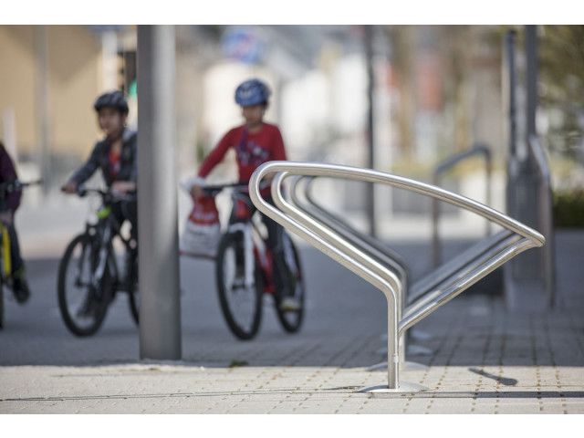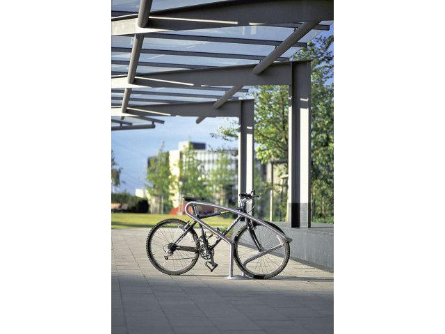 ABES Bicycle-Stand 450-2 is a frame made from bent steel tubes with a 42,4 x 2,5 mm diameter, an overhanging rear pipe, as well as mutually offset pipe ends. Only one foundation is required. Optional: convex cover plate with a 300 mm diameter. Mounting Concrete embedment (only one foundation required). Finish – Stainless steel 1.4301 pickled and smoothed, electropolished to customer’s requirement (high-gloss) – surcharge. – Hot-dip galvanised steel ST37, alternatively with powder coating in standard RAL colours or DB 703. – Other colours available on request at a surcharge. Note: For the removable version, the cover plate is needed. Overview: – Pipe diameter: 42,4 x 2,5 mm – Measurments: (H above ground x L x B in mm): 845 x 1240 x 244 – Optional: convex cover plate with a 300 mm diameter