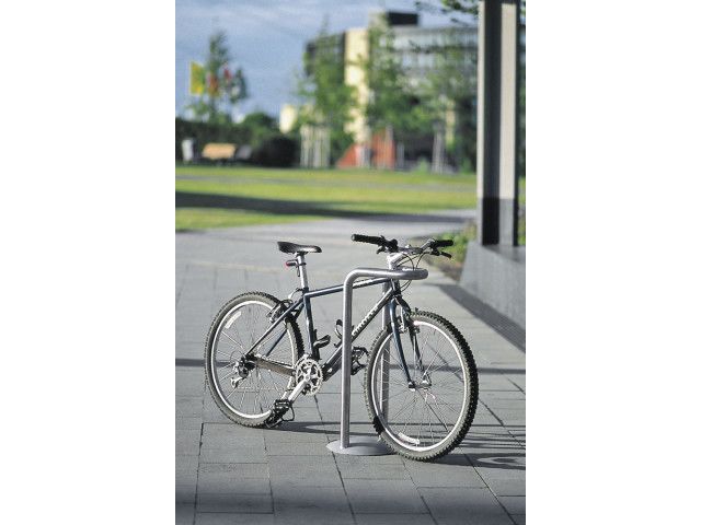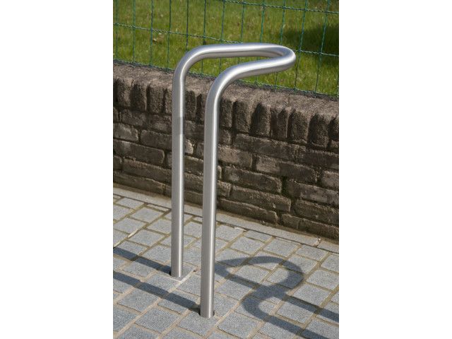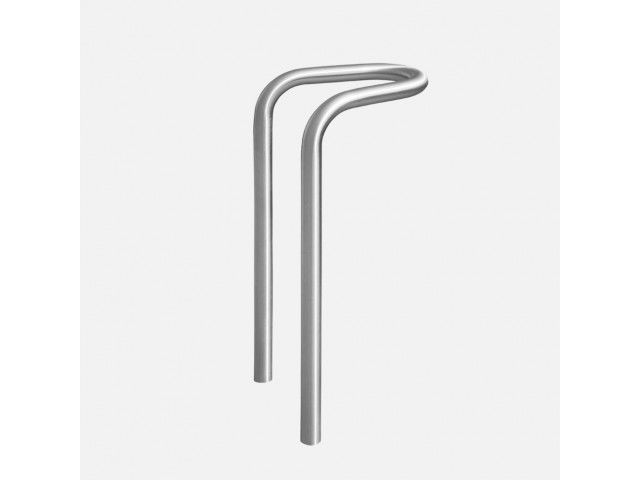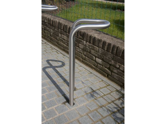ABES Bicycle-Stand 451 is a frame made from bent steel tubes with a 42.4 x 2.5 mm diameter, a vertical rear tube, parallel tube ends. Only one foundation is required. Optional: convex cover plate with a 300 mm diameter. Mounting Concrete embedment (only one foundation required). Finish · Stainless steel 1.4301 pickled and smoothed, electropolished to customer’s requirement (high-gloss) – surcharge. · Hot-dip galvanised steel ST37, alternatively with powder coating in standard RAL colours or DB 703. · Other colours available on request at a surcharge. Note: For the removable version, the cover plate is needed. ABES Bicycle-Stand 451 overview: – Pipe diameter: 42,4 x 2,5 mm. – Measurments: (H above ground x L x B in mm): 855 x 340 x 290 – Optional: convex cover plate with a 300 mm diameter