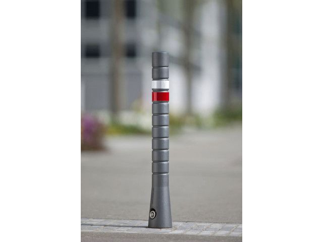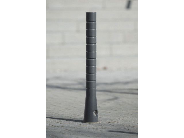 ABES Bollard 001 is a cylindrical bollard with ten circumferential grooves and a conical base. Mounting Removable with 3p-Technology, comprising a ground shell, a junction piece with integrated breaking point, two clamping cones and a hex head bolt. Alternative: concrete embedment. Finish – Powder coating in standard RAL colours or DB 703. – Accessories and special requirements such as different colours, red and white paint, reflective film or powder coating of chains, rings, shackles, etc. in the same colour as the bollard are available on request at a surcharge. Delivery: – The bollard, cast aluminium, powder coated in RAL or DB 703 Glimmer grey – Measurements (H above the ground x Ø in mm): 870 x 85/120 – Ground shell 300 mm (000.001), cast iron, galvanised – Junction piece (000.008), cast iron, galvanised – clamping bolt set, hex head (N1+N2+hex-screw), stainless steel 1.4301 (000.004)