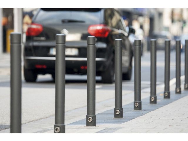 ABES Bollard 027 is a cylindrical bollard with a groove at the top and a cylindrical base. Mounting Removable with 3p-Technology, comprising a ground shell, a junction piece with integrated breaking point, two clamping cones and a hex-head bolt. Alternatives: concrete embedment (or fold down). Ground rosette option (000.031) Finish - Powder coating in standard RAL colours or DB 703. The basic package for ABES Bollard 027 with 3p-Technology contains: – The bollard, cast aluminium, powder coated in RAL or DB 703 Glimmer grey – Measurements (H above the ground x Ø in mm): 600 or 870 or x 85/98 – Ground shell 300 mm (000.001), cast iron, galvanised – Junction piece (000.008), cast iron, galvanised – clamping bolt set, hex head (N1+N2+hex-screw), stainless steel 1.4301 (000.004)