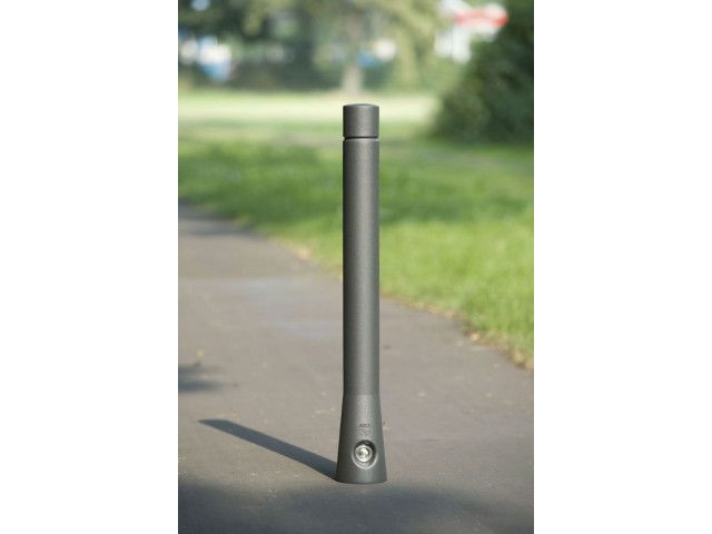 ABES Bollard 043 is a cylindrical bollard with a circumferential groove and a conically tapering base. Mounting Removable with 3p-Technology, comprising a ground shell, a junction piece with integrated breaking point, two clamping cones and a hex head bolt. Alternative: concrete embedment. Finish – Powder coating in standard RAL colours or DB 703. The basic package for ABES Bollard 043 with 3p-Technology contains: – The bollard, cast aluminium, powder coated in RAL or DB 703 Glimmer grey – Measurements (H above the ground x Ø in mm): 870 x 85/120 – Ground shell 300 mm (000.001), cast iron, galvanised – Junction piece (000.008), cast iron, galvanised – clamping bolt set, hex head (N1+N2+hex-screw), stainless steel 1.4301 (000.004)