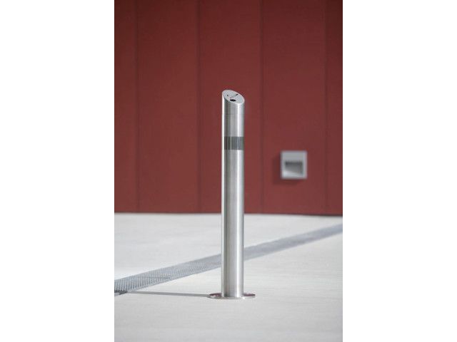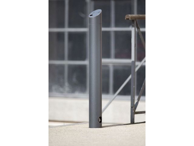 ABES Bollard-Ashtray 525 is fully cylindrical bollard ashtray with a sloping slot area. Labelling in the form of an outlined, laser-printed cigarette symbol. Mounting Removable with 3p-Technology. Alternative: concrete embedment or screw-on. Finish – Powder coating in standard RAL colours or DB 703. – May be unlocked for emptying using a triangular key. – Stainless steel 1.4301 pickled and smoothed, electropolished to customer’s requirement (high-gloss) – surcharge. Delivery for ABES Bollard-Ashtray 525 – Made of stainless steel 1.4301. pickled and smoothed or steel ST37, powder coated in RAL or DB 703 Glimmer grey. – Measurements (H above the ground x Ø in mm): 1000 x 108 – included triangular lock and key The basic 3p-Technology package contains: – Ground shell 300 mm (000.001), cast iron, galvanised – Junction piece (000.008), cast iron, galvanised – clamping bolt set, hex head (N1+N2+hex-screw), stainless steel 1.4301 (000.004)