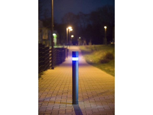 ABES Lighting Bollard 210 LED is a fully cylindrical lighting bollard made from cast aluminium with a flat top. Fitting of two LED light strips, each with 14 LEDs. Internal cable with connector plug, protection class IP67 and 24V low voltage. Mounting – Only available with 3p-Technology, comprising a ground shell, a junction piece with integrated breaking point, cable slot and anti-roll device, two clamping cones and a hex head bolt. – The Connection, including all technical requirements, is delivered by the client and is not included in this package. Finish Powder coating in standard RAL colours or DB 703. Technical information – Light unit: 2 x 14 LEDs. – Voltage supply: 24 V DC. – Total luminous flux: approx. 430 lm. – Power: 4 W. – Light emission: vertical approx. 360°, horizontal approx. 120°. – Light color: 6000 K (cool white), 4000 K (neutral white) or 2700 K (warm white). – Protection class: IP67.