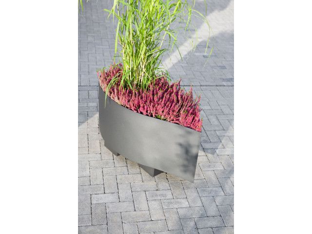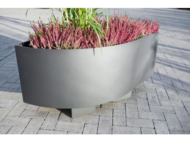 ABES Planter 710 is a plant pot with curved sides that taper at both ends. The base has apertures which may be sealed with a perforated plate cover. The container stands on rectangular tubes which serve as supports for hoisting equipment. The apertures of the tubes can be covered with removable caps. Mounting Free standing element. Finish – Stainless steel 1.4301 with powder coating in standard RAL colours or DB 703. – Other colours available on request at a surcharge. Size S / M / L / XL Width: 691 / 650 / 750 / 801 mm (widest point) Length: 1200 / 1500 / 1800 / 2000 mm Height of side wall: 390 / 390 / 490 / 490 mm Height of container, incl. base: 500 / 500 / 600 / 600 mm Volume: approx. 210 / 250 / 430 / 450 L Weight when empty: approx. 65 / 68 / 85 / 87 kg