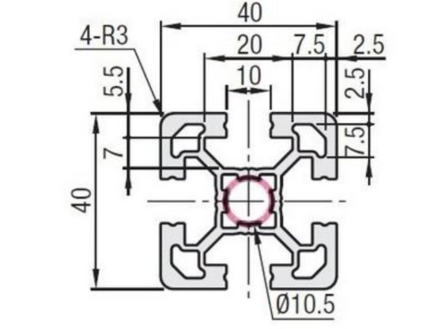 Square aluminium profile four 10mm side slots 40x40mm cross section