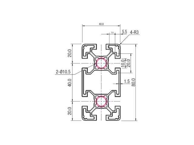 Light, black anodised aluminium profile eight 10mm side slots 40x80mm cross section