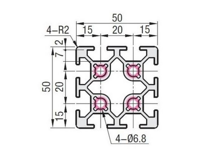 Square aluminium profile eight 8mm side slots 50x50mm cross section