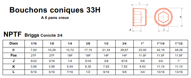 American Screws : Bouchons Coniques 33H à Six pans Creux- NPTF Briggs Conicité 3/4