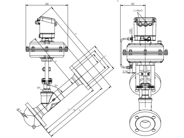 Pneumatic control valve with angle seat design. The angle seat design offers a high flow capacity, the flange connection an easy installation. The integrated digital or analogue positioner is coming along with a very compact design. All wetted parts are made from stainless steel.