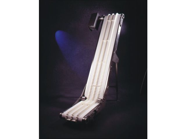 The angled conveyor GES-80-K-W has a white belt, that is FDA approved. It is specially made for the use in food production or in the pharmaceutical or chemical industry. The profiles of the frame are made of stainless steel.