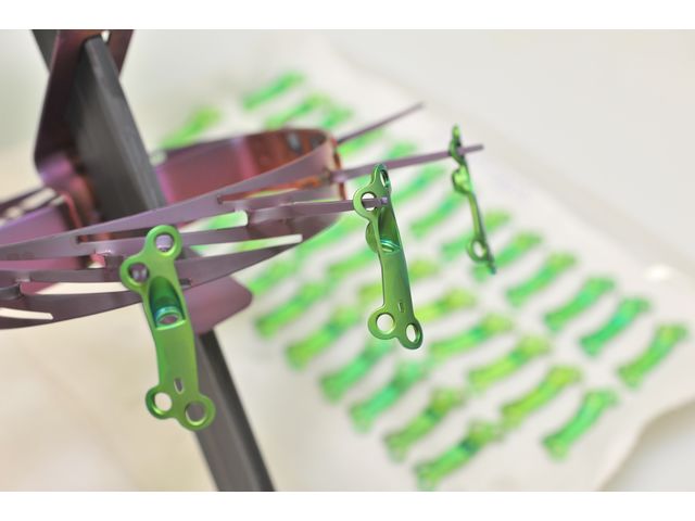 This electrochemical processes leading to formation of a titanium oxide layer on the surafce of products, granting the materials enhanced resistance to wear and corrosion. In addition to protecting medical devices, theses processes make it possible to color them (without coloring agents or pollutants) thanks to the phenomenon of interference and crystallographic prientation of the oxide formed, while enhancing their biocompatibility through modification of surface polarity.