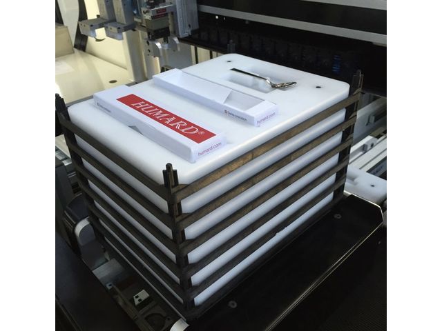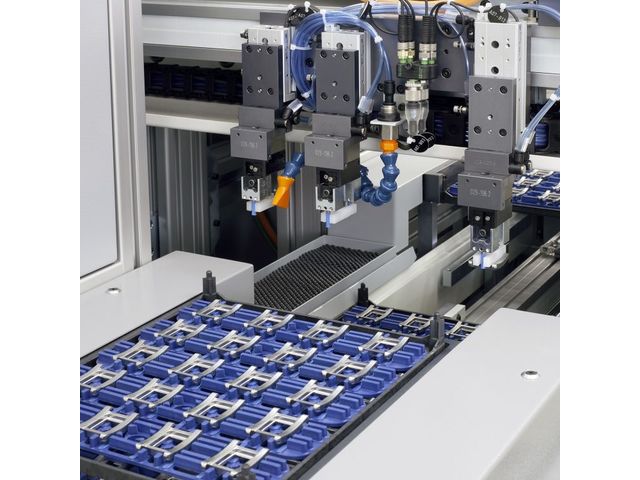 The palletizer then picks up a tray and places the finished workpieces in the desired position and orientation on it. When full, the tray is piled at the end of the line on the stacker or onto a cart.