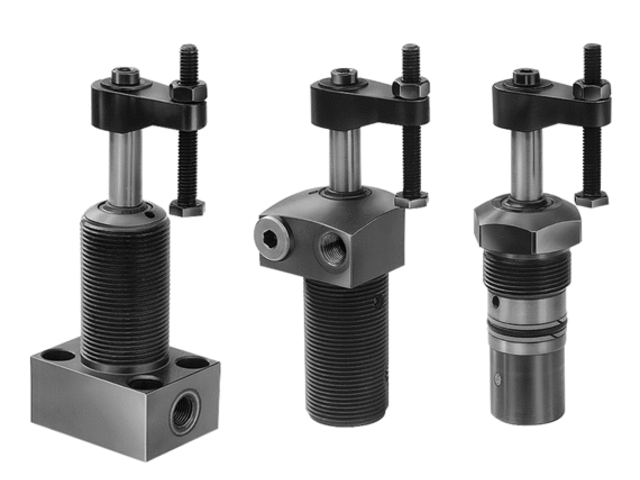 Hydraulic work supports are used to provide a self-adjusting rest for the workpiece during the machining operations. They compensate the workpiece surface irregularities, also vibration and deflection under machining loads. The threaded-body design allows for spacesaving and direct installation into the fixture body. Oil supply is made through drilled channels.