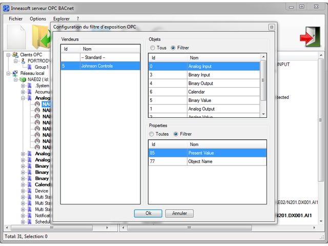 “ • BACnet/IP • OPC Data Access 1.0/2.0 • Detailled view of connected OPC clients and associated tags • Filter OPC tags exposed • Name proprietary vendor, objects, properties and units • Import/Export to EDE format • Ease of use • Choice of the network interface of the computer • Multilanguage (French and english) • Opening/Saving configuration • etc... ”