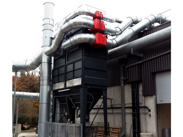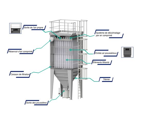 “ This dust collector has a high-performance cleaning system with reduced compressed air consumption, allowing the treatment of high-concentration dust removal systems with high filtration speeds while guaranteeing a rejection rate of around a few mg/m3. It can be adapted to all types of dust, standard, explosive, fine, fibrous, etc., thanks to its compact and wide versions (filter bag spacing) and to a wide choice of filtering media. It also allows the neutralisation of certain gases by injection of neutralising agent. It can be equipped with an indoor or outdoor explosion vent to filter explosive dusts in accordance with the ATEX directive. The compressed air manifolds with pneumatic valves can be positioned outside the clean air box for easy maintenance. The modular design allows for very high airflow rates while optimising floor space requirements. The fully welded construction ensures maximum air tightness and operation with high temperature air flows. Easy and safe maintenance thanks to the access (ladder with crinolines and guardrails provided as standard) to the cleaning system and to the filter bags on the clean air side from the upper part of the dust collector. ”