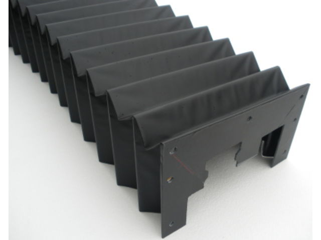 Our accordion bellows are designed to protect your machine slides. Our bellows, designed in-house or manufactured from your drawings, are reinforced with one-piece PVC stiffeners welded into each pleat to maintain their shape even at full extension. The stiffeners hug each slide cross-section tightly for proper operation regardless of bellows position. Depending on your specifications, choose our polyurethane exterior coating for oily environments, or our special elastomer coating if your machines are exposed to hot projections or sparks. Bellows ends can be made from PVC or steel, depending on requirements.