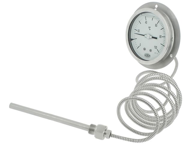 Dial thermometers are comprised of an airtight Inox case, Ø75, 100, 125, 160mm, protecting a white aluminum dial with black numbers.