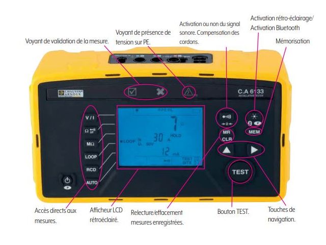 “ ● Earth measurement by stake and loop methods ● Continuity measurement at 0.2A ● Insulation testing ● RCD testing: current and trip time ● Automatic test sequences ● Storage of test results ● ANDROID application for report generation ● Power supply by mains-rechargeable batteries, USB socket or vehicle cigarette lighter ”