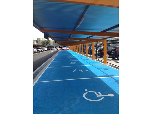 The structure is made of a simple or double shelter, built-in the foundations. The roof is usually made of trapezoidal galvanized metal sheets. The latter is fixed to the structure with self-drilling screws and neoprene washers in order to guarantee the sealing. We can supply different types of canopies according to the client’s expectations.