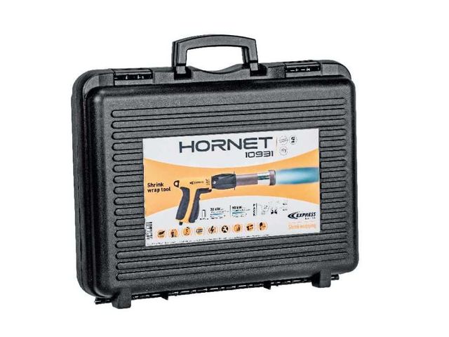 The Hornet shrinkforming gun in its comprehensive ready-to-use case (Cat. No. 10901), is one of the most recent developments of the Express Shrink Wrapping R&D department.