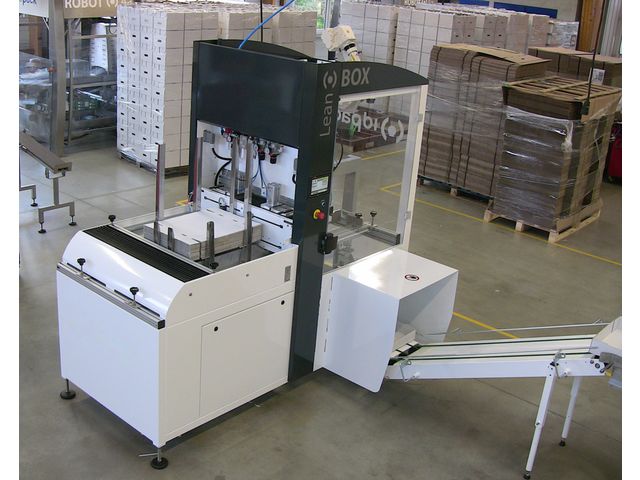 Provided with a 304 stainless steel frame or a customized color, the LEANBOX can be equipped with a variety of options: liftable exit conveyor with retainer, directional wheels with brakes, 25 kg glue storage hopper, 1500 mm long autonomy store, 3-color light marker, sparkling glass, stacker for empty box (StackBox for single boxes or StackBox + for boxes with lids), glue reserve with an autonomy of 2 to 3 days depending on the speed...