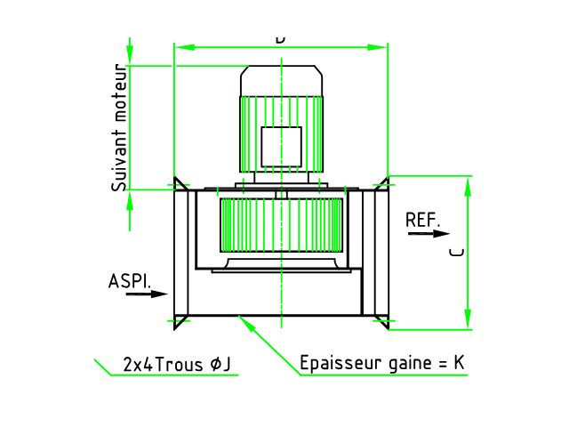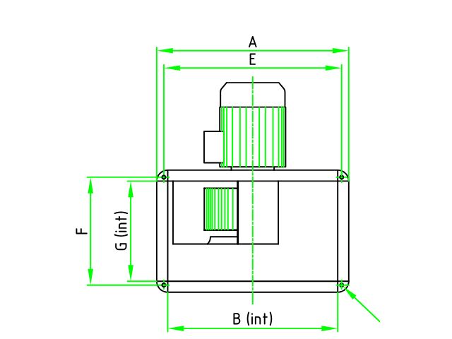 Centrifugal fan incorporated out of duct, blowing inlet and outlet out of line, with an high efficiency wheel with forward curved and setted blades type TURA, direct driven, motor outside the airflow, with connecting flange, out of galvanized steel, stainless steel, aluminium.