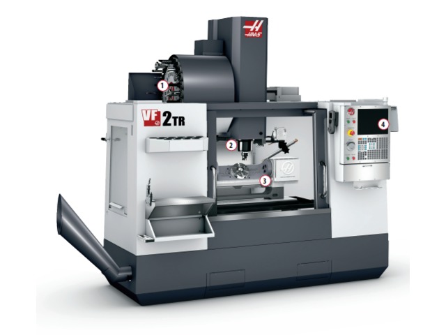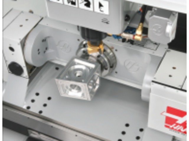 5-Axis Vertical Machining Center; 50" x 26" x 25" (1270 x 660 x 635 mm), with removable 8.27" (210 mm) 2-axis trunnion rotary table, 40 taper, 30 hp (22.4 kW) vector drive, 8100 rpm, inline direct-drive, 24+1 side-mount tool changer, 710 ipm (18.0 m/min) rapids, automatic chip auger, programmable coolant nozzle, power-failure detection module, 1 GB program memory, coordinate rotation & scaling, color remote jog handle, macros, high-speed machining, 15" color LCD monitor, USB port, memory lock keyswitch, rigid tapping and 95-gallon (360 liter) flood coolant system.
