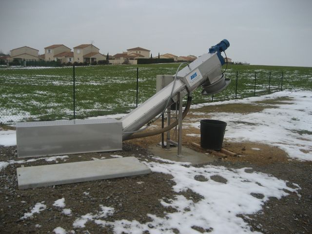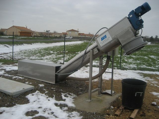 The effluent is filtered through the grid and the captured waste is unclogged by a brush on the edge of the spiral.