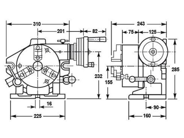 • Gear ratio 1:90, disengages for direct division, manual 360° rotation of chuck