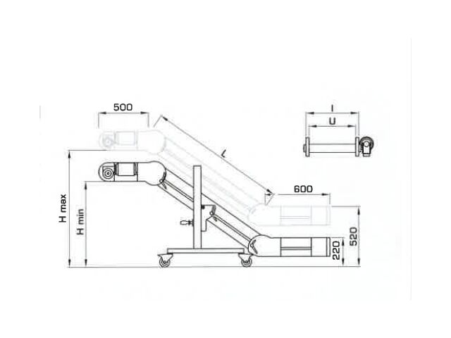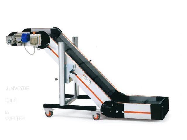 The height is adjustable thanks to the vertical rails. The inclination is variable at the 3 pivot connections. This conveyor is suitable for use in the plastics industry.