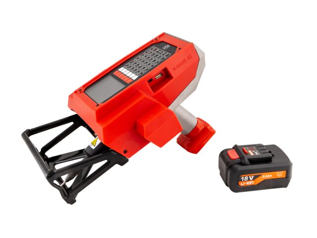 The e-MARK XL marking gun is a cordless, portable, all-in-one micro-percussion machine that can mark large parts thanks to its very large marking window (120x40 mm). It comes with two batteries and a fast charger, all contained in a convenient storage case, allowing you to continue working with one battery while the other is charging.