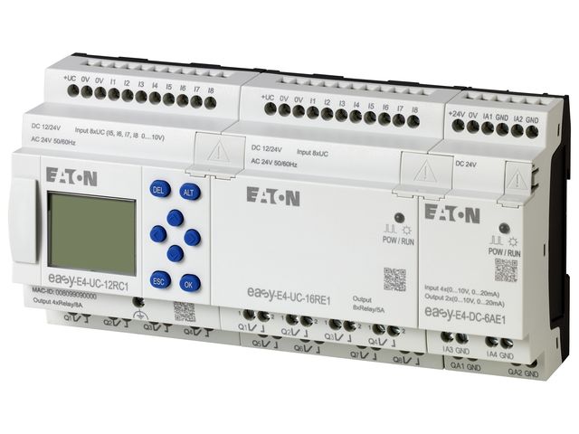 With the easyE4 control relays from the MoellerTM series, control tasks can be implemented quickly and efficiently, whether it be in industrial, specialized manufacturing or building applications. Up to 11 I/O expansions as well as a wide range of voltages are available. The new easyE4 devices are not only easy to handle, but also offer simple and flexible programming. The easySoft software is intuitive to use and comes with four different programming languages. The addition of other functions, such as the integrated web server and Ethernet interface, turns the easyE4 into a powerful control relay that can also be integrated into IIoT system architectures.