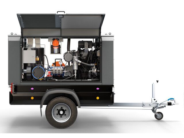 With up to 95 °C façades, small pipes, industrial flooring and other surfaces can be easily cleaned, oil and grease can be washed away and coating can be removed. The compact and light single-axle trailer can be brought to site with almost any middle class car. The easy to understand WOMATIC 4-Control with operational status monitoring, pressure-rpm regulation and pressureless circulation ensures high operational safety, low wear and tear, long service life, and last but not least, minimal fuel consumption. The tank system with 5 chambers including a safety trough hinders operational fluids escaping, such as fuel, oil or softeners.
