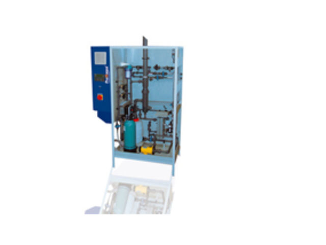 Electrolysis plant mounted ready for operation on a powder-coated stainless steel frame with programmable logic controller (PLC) in control cabinet integrated softener electrolytic cell pH value monitoring of electrolysis ATEX-certified bleeding system and side salt dissolving tank with level monitor Level sensors to monitor the storage tanks for sodium hypochlorite to be provided by the customer The scope of delivery also includes a central injector system matched to the plant to meter chlorine gas, sodium hypochlorite and sodium hydroxide, inclusive of a booster pump Automatic monitoring of the water hardness downstream of the softener and chlorine gas detector for plants from 600 g/h