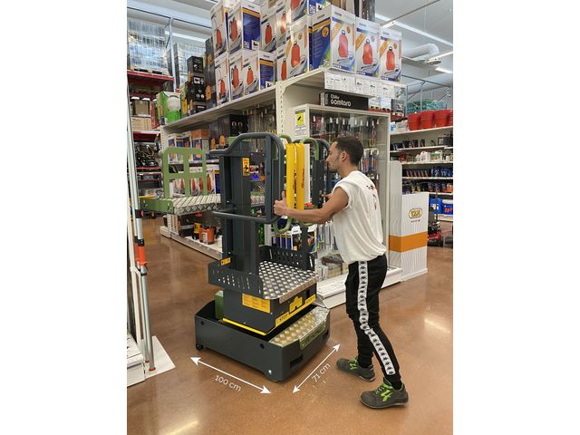 Elevah 40B Picking is the push around stock picker with automatic elevation with maximum working height of 4 meters completely renewed in design and performance. It allows to carry out picking activities up to 100 kg. Compact (only 71,5x136 cm), comfortable and easy to move.