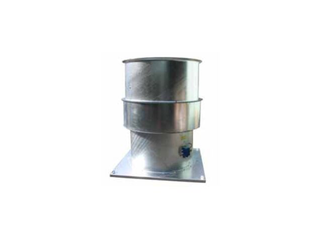 Roof axial fan with vertical air flow base and anti draught shutters in outlet.