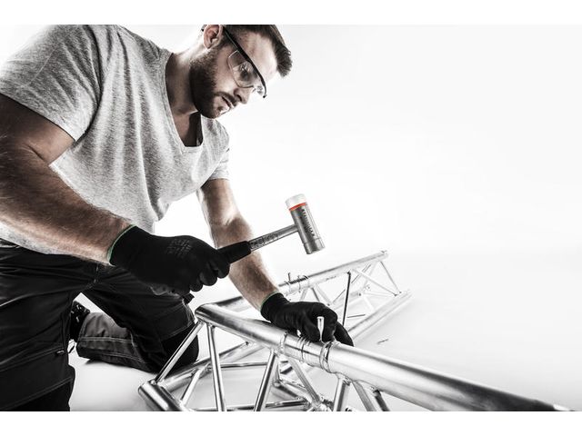 With steel tube handle and ergonomic rubber grip, hammer head made of heat-treated steel, one-sided induction hardened, opposite side with exchangeable nylon insert.