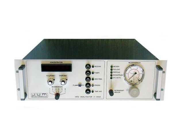 The J.U.M. Engineering HFID Model 3-300A has proven itself over 27 years as a space-saving version of the rugged VE7 analyzer. This is a highly reliable, heated 19-inch rack-mounted total hydrocarbon (total organic carbon gas) analyzer. Designed for very low drift, high precision, sensitivity and stability. The 3-300A uses a hydrogen flame ionization detector (FID) in a heated furnace to prevent the loss of high molecular weight hydrocarbons and to provide reliable performance in analyzing high concentrations down to very low levels of traces of gaseous organic carbon contaminants in emissions, air and other gases and high purity gases.
