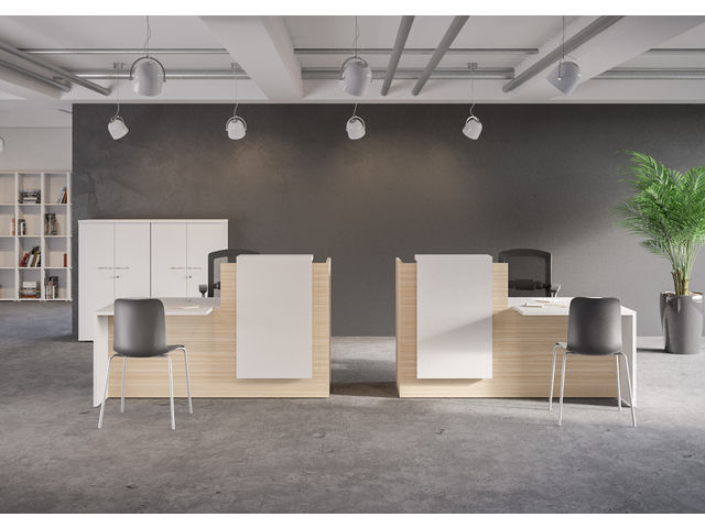 With their recti-linear lines, Fifty-Fifty reception desks combine a work surface and a reception top in a single unit.