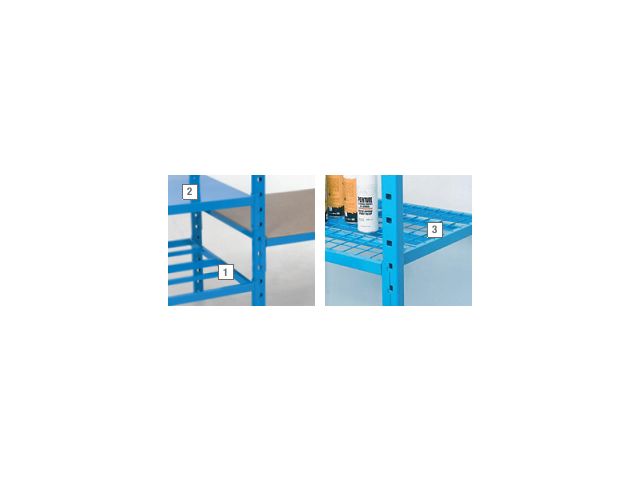 3 types of shelves of tubular design with 4 upright-connectors and 2 clamps for the 250 kg version and 3 clamps for the 500 kg version.