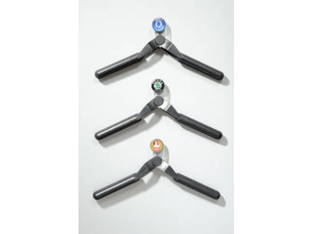 The hanger can be magnetically attached to steel closets, walls or whiteboards. It saves room and can be send easily. Coat, jacket or scarf are hung quickly in place with the help of the Maghanger designed and manufactured at home. The hanger is foldable and can be provided with a sparkling 3D logo by means of a 45 mm large doming in the center.