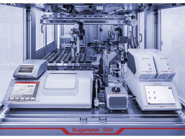 “ Reliable quality control for the sugar industry, fully automated Combining sample preparation, high-precision measurement and data transfer, the Sugarlyzer 5000 subsidizes a whole lab, eliminating up to 8 manual steps with one conclusive system that mobilizes pre-defined workflows. This fully automated factory-control lab integrates measurement of all crucial parameters which are central to the sugar production process. Enjoy all the benefits of world-class instruments including MCP 5300, DMA 4501, Haze 3001, Abbemat 650 and PH 3201 in one combined, ready-to-use lab that facilitates Anton Paar's high precision guarantee. If needed, additional instruments can be added upon customer request. Planning security for your quality control workflows The Sugarlyzer 5000 offers the swiftest shift to automated lab analysis in the sugar industry. It ensures the reliable processing of sample 24 hours a day, including sample preparation and measurement. Process up to 300 samples per day without obtaining skilled workers or training manual laborers to manage complex equipment. The Sugarlyzer 5000 achieves maximum productivity by working on up to 5 samples at the same time. This is complemented further by the addition of stainless-steel cups that ara automatically cleaned, produce minimal waste and guarantee longevity. Free up time and resources Automated sample preparation frees up time and resources by leaving the Sugarlyzer 5000 autonomously prepare, process and clean samples. It even executes these workflow steps in parallel for multiple samples at the same time. Eliminate the need for constant management and observance of samples as the Sugarlyzer 5000 mobilizes all repetitive tasks according to your requirements. The Sugarlyzer 5000 is equipped with extensive storage to free up users for more than 6 hours, allowing them to with other important tasks. Even when the results are available, there is no need to intervene as the combined data is exported automatically. Flexible to adapt to your workflows Samples from different stages of the sugar production process have different requirements. The Sugarlyzer 5000 offers customers the option to choose from different modules. Whether your sample needs dosing, mixing or filtering, this all-in-solution handles your sample at every step of the way. Digital job management in combination with automation ensures that every sample is treated according to pre-defined standard operating procedures (SOPs). This enables repeatability and consistency throughout the process. The customer can define how a sample is run (neat, diluted, filtered), and the Sugarlyzer allows the customization of clarification chemistries, mixing times, as well as the temperature during sample preparation. Quality control results you can rely on Thanks to the sample processing unit (SPU), users are ensured the fast, precise, and simultaneous provision of samples to all instruments, facilitating consistent and accurate results across the board. There is no need to intervene with the sample during or after preparation, therefore minimizing human error and the risk of contamination. Enjoy the versatility of the SPU, which combines all the instruments needed for sugar analysis, into a comprehensive, all-in-one solution. ”