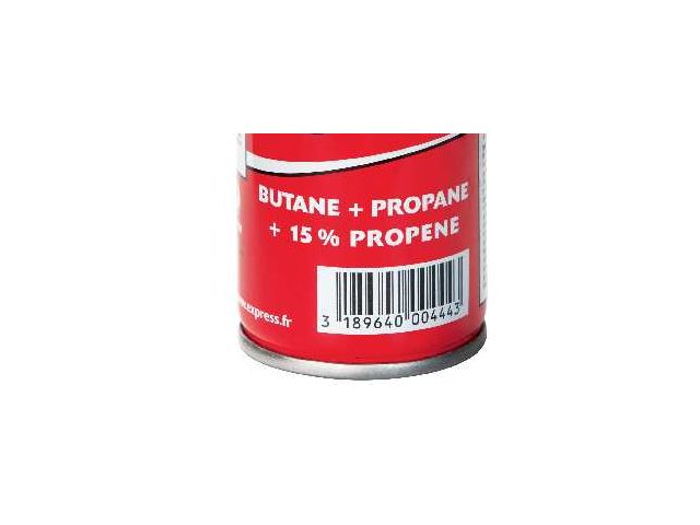 Gas cartridge Cat. No. 445 26% propylene + butane + propane (60g), with foam to allow it to be pointed downward immediately.