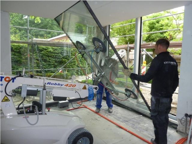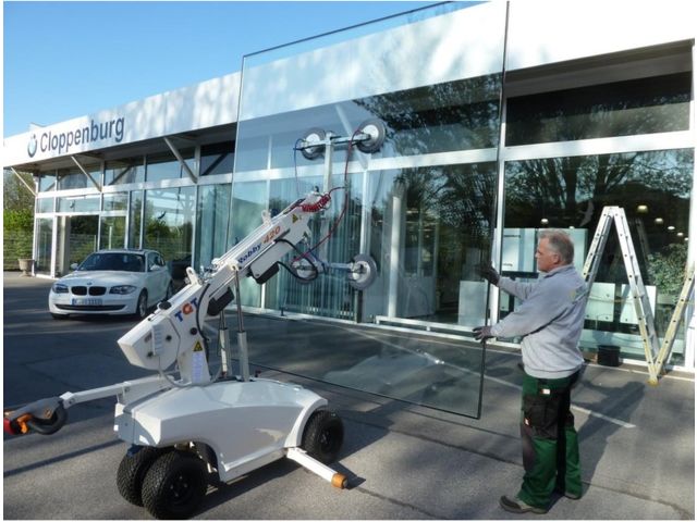 For indoor use + All terrain use thanks to its specific tires. Ideal for installing large windows and heavy panes.