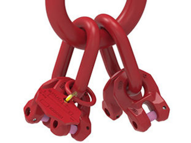 AK 4-leg master link with 4 in all directions movable welded RG connectors. Thus ensuring that only the correct chain diameter and number of legs can be connected. Complete identification tag. Pre-assemled connecting bolt and tensioning sleeve. Manufactured in compliance with DIN EN 1677-4. The size corresponds with that of suspension link type A, and connecting link type B acc. to DIN 5688.