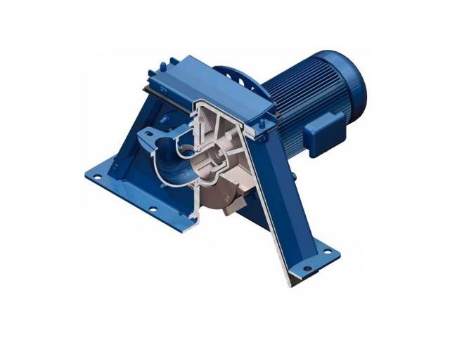 This aggregate is, like the smaller variant, a single-disc blasting wheel with six insertable blades. We offer these high-performance turbines with a blasting wheel diameter of 420, 440 and 460 mm. Motors from 18.5 to 37.0 kW provide the drive mechanism. In case a drive with bearing block is used instead of a direct drive, stronger drives are possible.