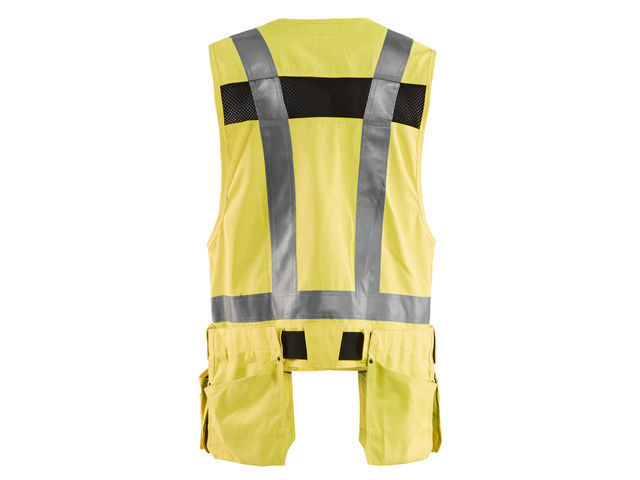 Modern craftsman waistcoat with many practical pockets for tools and accessories. Detachable nail pockets and waist strap to reduce shoulder and neck strain. It even has double zippers at the front to adjust the width, which provides a better fit and improved comfort. Mesh panels that make the waistcoat light and provide good ventilation. Certified according to EN ISO 20471, S class 1, M-4XL class 2.