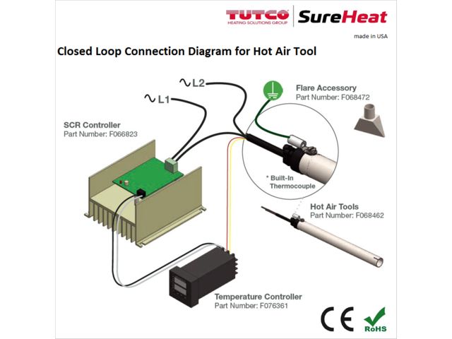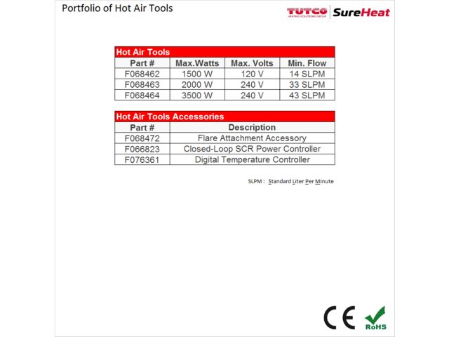 Hot Air Tools are multi-purpose electric air heaters with a built-in thermocouple for precise temperature control. The compact size makes this product perfect for single phase OEM applications needing closed loop control. Its 304 stainless steel body construction is slotted for flared accessories and is made to withstand pressures up to 4 bar and temperatures up to 760 ° C. Air is typically supplied through compressed air lines.